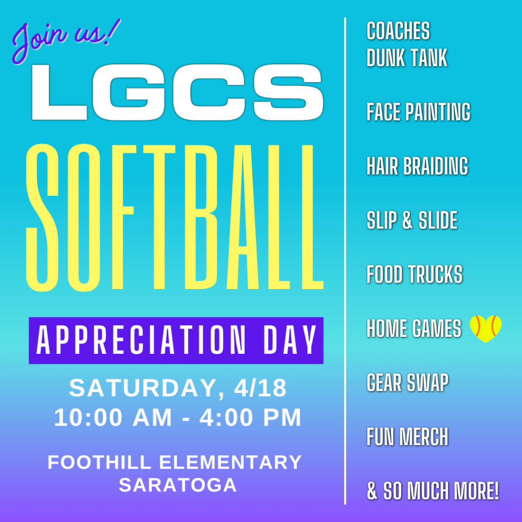 Hello LGCS Spring Rec Families, We are looking forward to Softball Appreciation Day this Saturday, April 18th at Foothill Elementary. In addition to game play, there will be fun activities for the kids from 10 -2pm, Kona Ice, taco truck, an equipment exchange, slip n’ slide, and chance to dunk their coaches in the dunk…